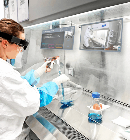Seit 2011 erstellen wir kurze Anleitungsvideos und E-Learning-Kurse für die biopharmazeutische Industrie, um einem konkreten Bedarf in diesem Sektor gerecht zu werden: der Vereinfachung und Sicherung komplexer Vorgänge, die sehr strengen Normen unterliegen. Mit den jüngsten technologischen Fortschritten haben wir uns 2023 der Augmented Reality zugewandt, um die Anleitung über ein vernetztes Headset in die Handlung zu integrieren.